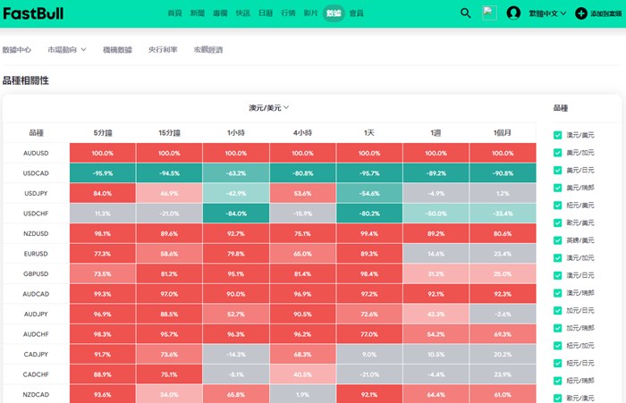 分散風險的最好辦法就是同時交易不同的貨幣對,但前提是要了解貨幣的相關性。 貨幣的相關性就是一段時間內,兩種貨幣對的價格是朝相同、相反或完全隨機的方向移動。當交易兩種貨幣對呈高度正相關時,不但沒有分散風險,反而是加倍風險。 Fastbull網站有即時的相關性整理。 相關性的強弱和方向會隨著時間改變,當我們同時交易多個貨幣對時,要定期關注貨幣對最新的相關性,因為它與風險變化息息相關。