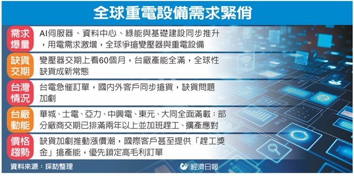 經濟日報 記者朱曼寧、江睿智/台北報導全球AI搶電燒到重電設備,缺貨、漲價問題炸鍋。曾文生昨日出席「電網人才發展聯盟獎學金暨劉書勝紀念獎頒獎典禮」,他致詞時表示,全世界都在競爭電力,所有電力設備都漲很多。一個變壓器過去要排12個月至18個月,現在要排24個月,甚至美國報告顯示要排60個月,他直言「看到都傻眼」,全世界電力設備競爭非常激烈,包括天然氣機組。台電董事長曾文生昨(19)日示警,近期電力設備缺貨又漲價,甚至交期長達五年。重電業界表示,全世界都在要貨,台電狂催搶重電設備,現在各大廠的產能都爆滿,大型重電設備缺貨恐成新常態。AI用電需求爆發,重電業界直指,電廠建置所需的大型變壓器需求「來得又急又多」,現在台電比他們還急、急叩台廠備產能,但國內外客戶都催著要貨,即使業界全面動起來都仍面臨大缺貨問題,下一步恐還有漲價潮。其中,華城(1519)、士電、亞力、中興電、東元等指標大廠,均全力支援國內需求,並滿足國際客戶。曾文生提到,最近與台灣貿易密切國家,紛紛投入AI,拉動電力龐大需求。這樣局部性龐大需求,連帶使台電思考要如何安排負載、電網如何調節、電力如何使用等問題。重電業者表示,變壓器從全球基礎建設、綠能發展下,就開始延生出需求,到了近期的AI產業發展,需求更是急速拉上來,國際大廠交期紛紛延長,國內業者同樣產能吃緊,引爆變壓器大缺貨潮。電力供應鏈業者指出,由於過去市場對變壓器需求少,電力設備產業沉寂了多年,導致許多零組件廠商也紛紛不做了,但這兩年需求極速湧上,專做變壓器的零組件廠商一時無法因應,而這個狀況就會「牽一髮動全身」,零組件產能出不來,變壓器交期自然就會延長。重電業者也透露,近期有廠商被停權,產能吃緊狀況也更為嚴重,台電很急,也希望業者能共體時艱,盡量把國內需求率先填滿,業者全開產能也積極擴產因應,但仍難解燃眉之急。亞力表示,交期急如星火,業者必須得把產能塞得很滿,還要加班趕工才能符合交期。士電則指出,未來兩年產能已經全滿,不僅趕工,也在積極擴廠中,力拚變壓器都盡量如期交貨。華城表示,目前國際變壓器大廠的交期約四年以上,華城交期在兩到三年左右。👉俗話說的好:「省小錢 賺大錢!!」👈 這麼精明的你,怎麼會錯過這個好機會 大昌證券給您不一樣的選擇 低手續費,等您來唷~ 🔔美元保單、台幣保單持續推廣中👋 🥰指定開戶就送精美小禮唷~~🥰 👉大昌證券黃靖貽👈 開戶專線:03-5246177 賺錢專線:03-5250567 行動電話:0916168835 公司電話:03-5222868 *368🙋‍♀️🙋‍♀️歡迎按讚分享唷🙋‍♀️🙋‍♀️#全省皆可開戶哦~~LINE ID:0916168835同手機號碼#證券、期貨選擇權、海外期貨、複委託手續費優惠中#大昌期貨開戶 #港股手續費 #美股手續費#大昌證券 #大昌期貨 #保險 #美股大昌證券股份有限公司新竹分公司 營業員:黃靖貽連絡電話:(03)5222868分機368、369手機:0916168835Line ID:0916168835公司地址:新竹市北區中山路三號二樓114年金管證分字第0168號 委任期貨商:大昌期貨股份有限公司