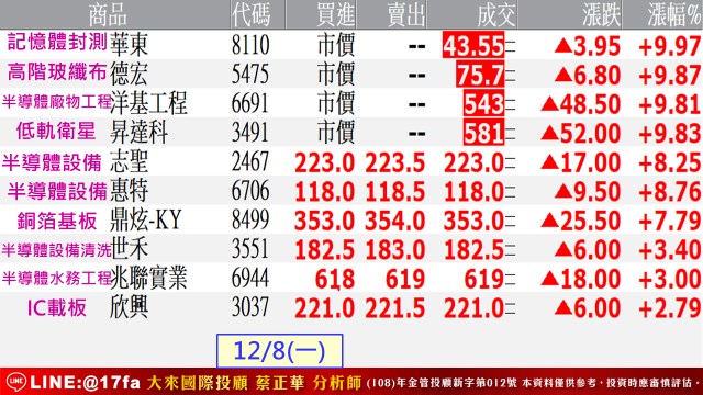 今天是12/8(一)大家好,我是正華今天應該有感覺到吧!賺錢好快而且比上周容易很多原因很簡單,我說過了指數KD上了80才會真正開始你回看任何一次都是這樣能賺到大錢的會出超暴力飆股的週期指數KD都在80以上,黏住就是關鍵很多券商明年目標價放在3萬我年初就講過了3萬在價格上其實沒太大意義大N字的測距也不是在3萬是3萬6且3萬根本也不用到明年12月還有3週半夠了,2025收最高現在重點是賺錢看上表,大盤目前是剛反攻但已創新高的股票是哪些除了漲價三族群(記憶體、PCB、被動元件)就是設備族群比例佔最多而量增的股票則是以11月營收亮眼的為主這就指引了新資金進場的流向跟著錢走賺最快2344華邦電攻上漲停我11月曾經當著全國面前說過我100%一定會買記憶體第二次買點上週的買點是我跟所有觀眾朋友的約定記憶體旺三年其實沒有甚麼秘密黑馬2344華邦電、2408南亞科、6770力積電、2337旺宏、8299群聯、8110華東、8150南茂、8131福懋科、4967十銓、8112至上、5289宜鼎...也不過就是這名單不會超過20檔輸贏不在神秘黑馬人人都知道的股票輸贏就是買賣點上週低點我大買了所以我們贏了今天的故事講得再好不如上週買點買的好這就是現實實戰相對論,抓的是發動點如果你還在納悶為何沒量一直漲這很簡單很多人還在等解套那表示能繼續漲買盤還在後面換股+新股進場才是年底大賺關鍵字諮詢專線:(02)2365-9333也歡迎大家按讚、訂閱、分享並加入Line@頻道https://lin.ee/MPVsFV5諮詢專線:(02)2365-9333