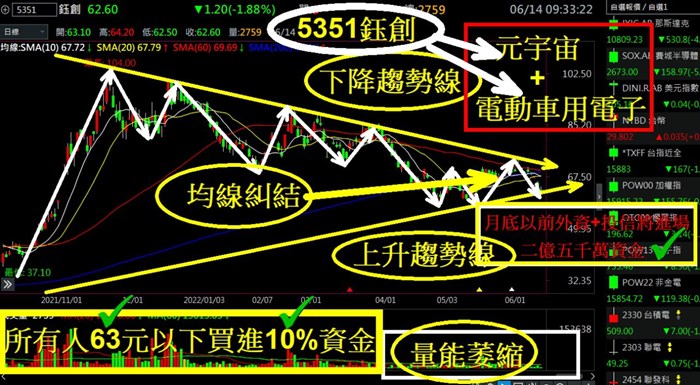 ✅5351鈺創: 極少數擁有元宇宙+電動車用電子雙題材加持的績優股,今年第二季淡季不淡,美系訂單能見度持續亮眼,月底前內外資將低檔買進二億五千萬資金,週二63元以下執行換股動作,買進建立一成資金,週四64元以下加碼一成資金,開始動作。