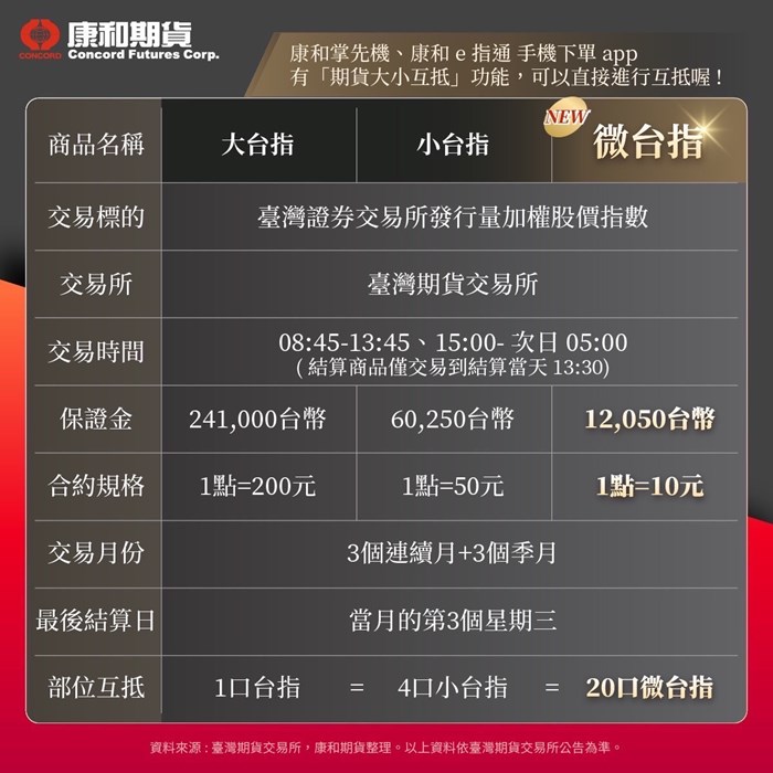 微台是台股期貨(大台)的微型版本,契約乘數為每點10元,契約價值為大台的20分之1、小台的5分之1。以加權指數24,000點計算,一口微台契約價值為24萬元,大幅降低交易門檻,使交易人能夠更靈活操作。