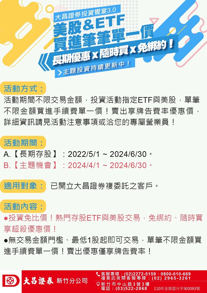 最近大家都在買ETF存股領配息 其實不只台灣ETF很熱門,現在很多投資人也往美國ETF開始存股!! 為了給投資人在存股這條路能夠存好存滿~~ 大昌證券提供手續費優惠 活動標的單筆買進不限金額通通固定手續費 ❤❤❤