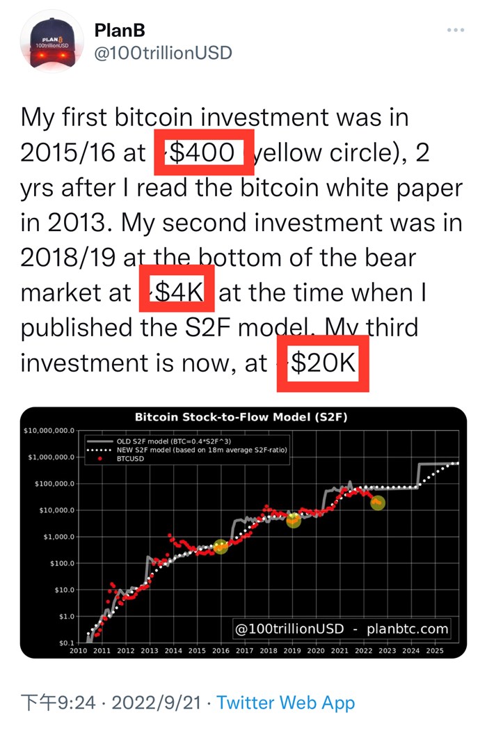 鏈上知名分析師-PlanB在社群平台上表示自己第三次進場買進BTC,前兩次分別在2015、2018,看看價格$400US、$4,000US,這次20,000US我若是他也會不痛不癢,既然信仰就也跟著小買一些,希望不要跟狂人一樣超級反指標就好!