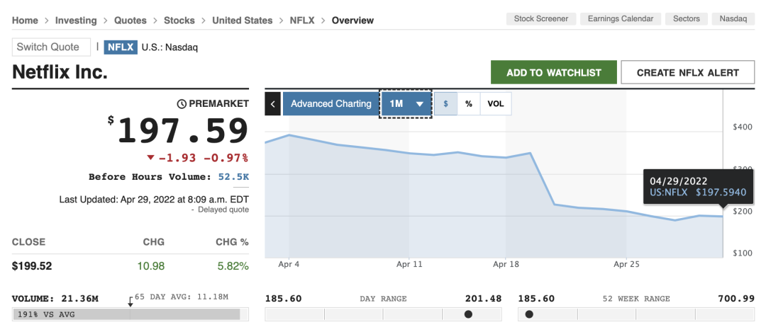 官方季報的數據顯示,Netflix在2022年第1季度淨利潤同比下降6%,流失了20萬付費用戶,而這一數字極有可能在第2季度漲到200萬。十年以來的首次用戶淨流失導致股價大跌,Netflix決定在未來幾年內推出一檔更便宜的、支持廣告的會員服務。