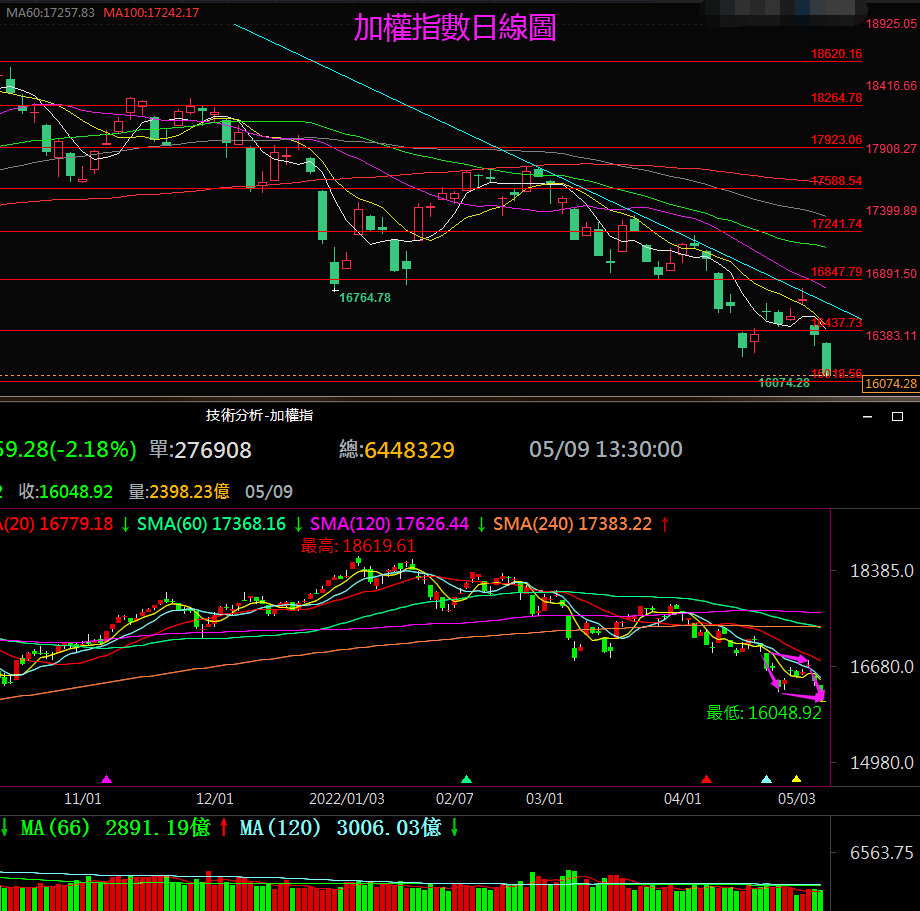 美股上周五全面收黑,台股今 (9) 日再度跳水,電子股續疲、金融股慘遭提款,各類股全盤皆墨,加權指數跌幅逐漸擴大,回測萬六支撐,終場重摔 359.28 點或 2.19%,收在全場最低 16048.92 點,創近 1 年新低,成交值 2398.23 億元。