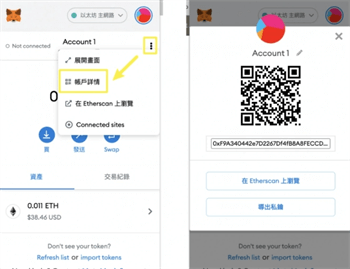 账户:Account 1 是您的当前账户名称,可以在设置中进行更改。下方显示的英文和数字组合是该账户的转账地址,用于以太坊网络上的交易。