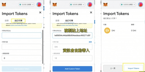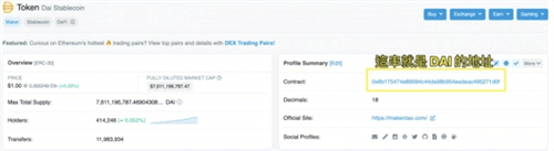 以添加DAI代币为例,您可以在Etherscan上输入“DAI”,然后在页面右侧找到DAI的智能合约地址,并将其复制粘贴到MetaMask中。