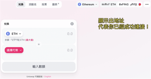 回到 Uniswap 页面,你会发现右上角已经显示了你的 MetaMask 钱包地址,这表示你已经成功将 MetaMask 钱包连接到 Uniswap 上了!现在,你可以开始在 Uniswap 上进行资产交换或提供流动性等操作了。