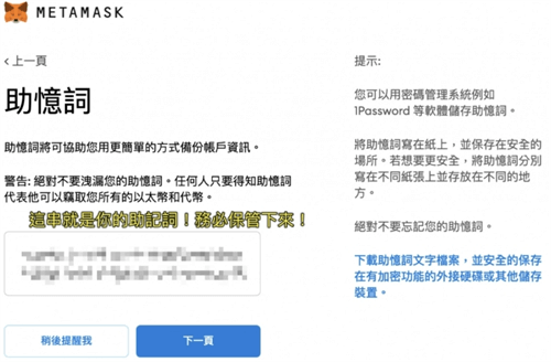 接下来是记录助记词的环节,这一步至关重要,甚至比设置密码还要重要。助记词就像是钱包的私钥,允许您在其他设备上登录MetaMask钱包。
