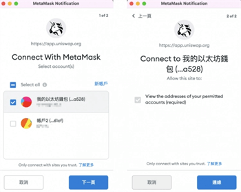 接下来,MetaMask 会弹出一个新的窗口,要求你选择钱包中的一个账户进行连接。选择好你想要连接的账户后,点击“下一步”。