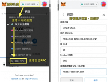 按照右侧图示填写以下信息,然后点击保存,即可完成币安智能链的添加。