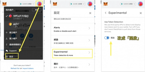 启用此功能可以让MetaMask尝试自动检测并显示您的代币。点击MetaMask右上角的账户图标,进入“设置”,然后找到“实验性功能”(Experimental)选项并启用它。之后,回到资产列表并刷新页面,您可能会看到新代币已经显示出来。如果仍未显示,请尝试下一个方法。