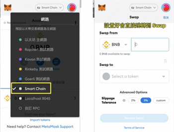设置完成后,钱包会自动切换到“币安智能链网络”,并可能邀请您体验Swap功能,您可以暂时忽略。