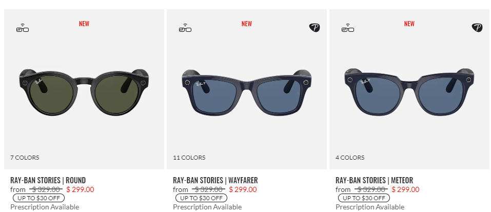 Meta 和雷朋(Ray-ban)共同開發的智能眼鏡Stories,和頭顯、Portal 一同構成了這次Meta Store 的“三駕馬車”。