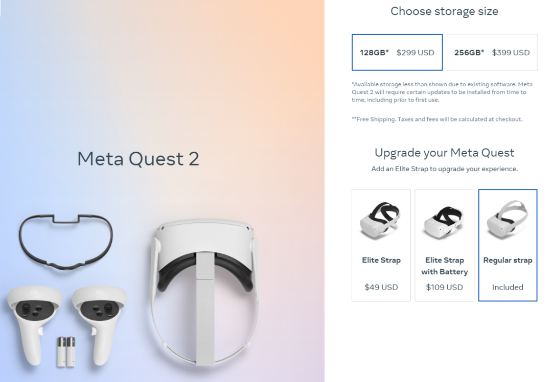 Quest 2 是目前Meta 公司面向消費者推出的旗艦硬件產品,價格高達299美元!這個價格包含標準版頭帶、兩支配套手柄、兩節五號(AA)電池。