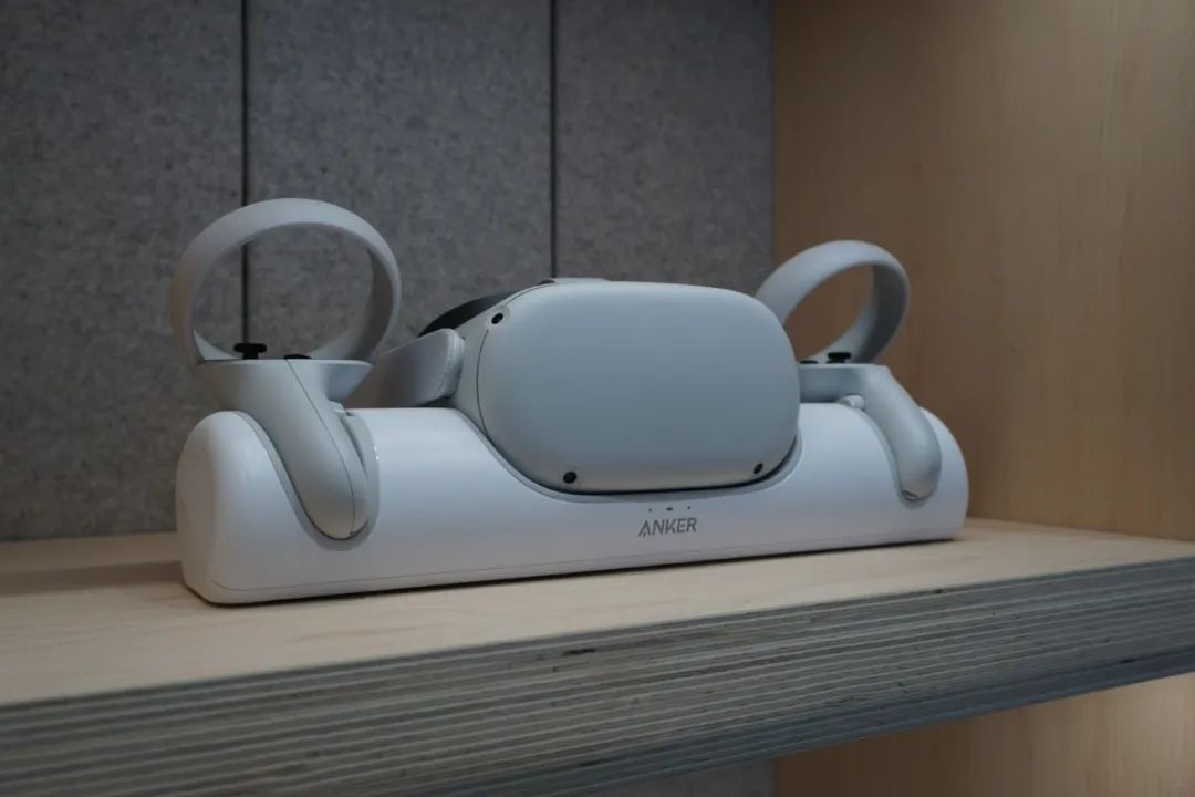 除了Quest 2 本體之外,Meta Store 這次還展示了自家和第三方合作夥伴開發的周邊產品,比如高級版頭帶、羅技(Logitech)的耳機,以及安克創新(Anker)推出的充電/展示底座等。