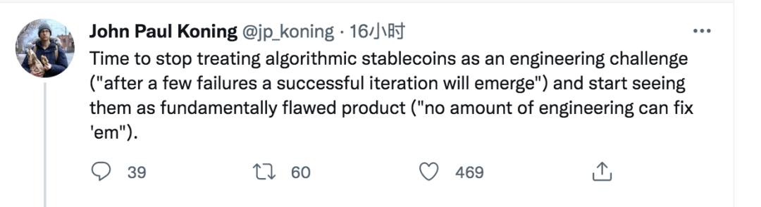 “是時候停止將算法穩定幣視為工程挑戰了(“即認為在幾次失敗之後,就會出現成功的迭代產品”),而是應該開始將它們視為存在根本缺陷的產品(即再多的工程也無法修復它們)。