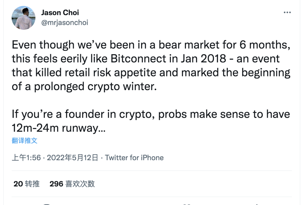 “儘管我們已經進入熊市6 個月,但這次事件給人的感覺就像2018 年1 月份發生的Bitconnect,這樣的事件扼殺了散戶風險偏好,並標誌著漫長的加密冬天的開始。