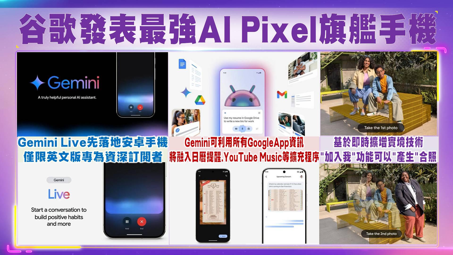 北京時間2024/8/14凌晨, Google推出新款智慧型手機、手錶、耳機,其中手機深度整合自家AI助手Gemini,除了有意與蘋果、三星一較高下外,也搶在蘋果這次秋季新品發表會正式推出Apple Intelligence前大秀肌肉。