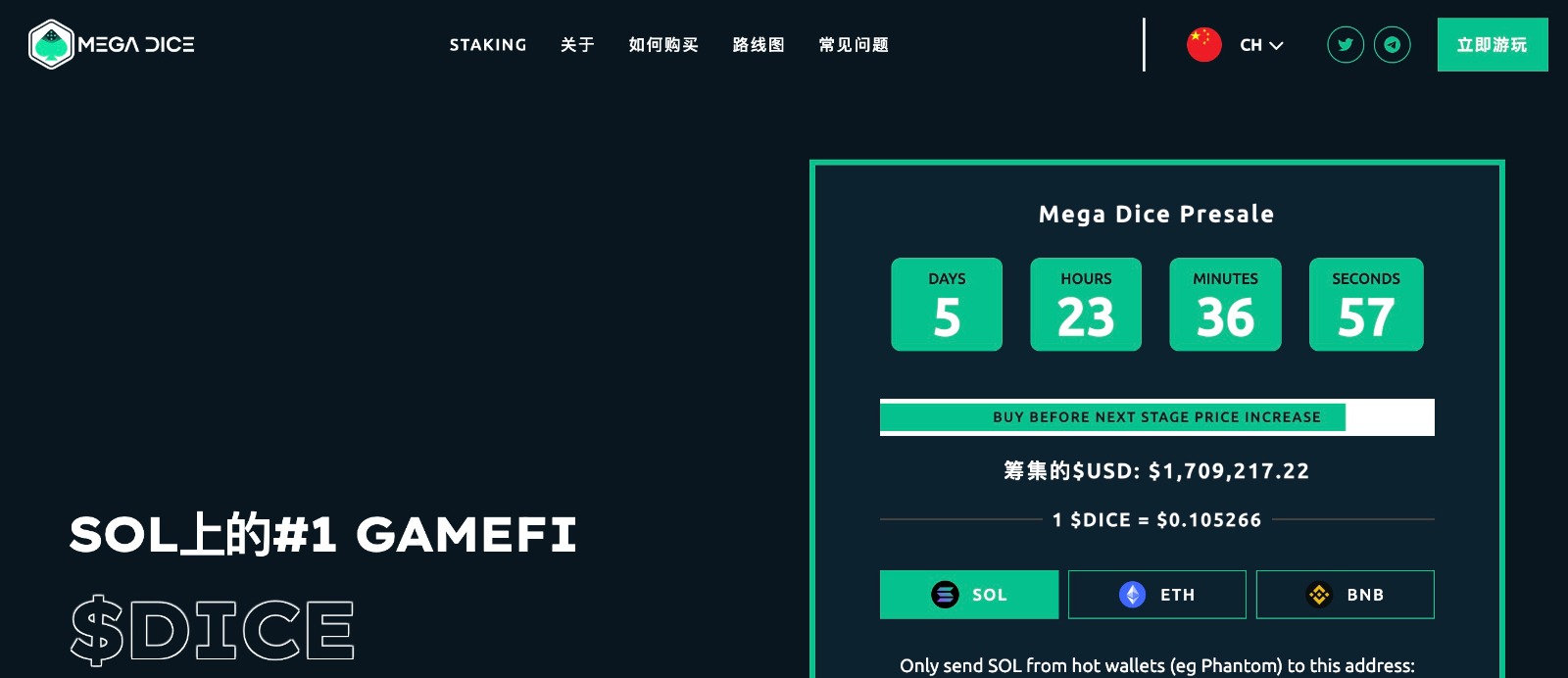 近日新推出的Solana博弈幣MegaDice($DICE)在預售階段引起了市場的廣泛關注,首日成功籌集超過30萬美元。作為一個加密貨幣賭場平臺的加密貨幣投資代幣,DICE的推出旨在進一步增強MegaDice平臺的功能和吸引力,此加密貨幣除了在平臺上用於遊戲和支付外,還可用於質押,提供了多種增值途徑。