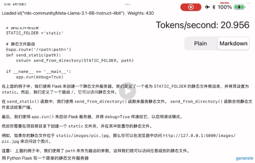 LLMEval 是一個蘋果 MLX 團隊在 GitHub 上開放原始碼的一個 Swift 示例應用程式,展示了如何下載 Hugging Face 的大語言模型(包括最新的 Meta Llama3.1、Google Gemma 等)並在 M 晶片的 iOS/iPadOS 裝置上編譯運行: