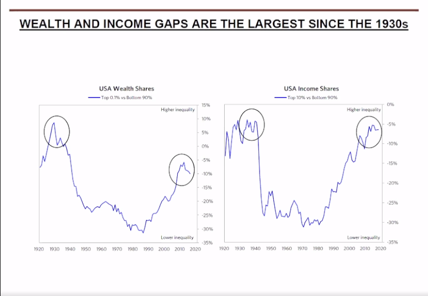 前面講的是印鈔,這一頁(▲上圖)代表的是1900年以來的財富差距和收入差距,非常重要的是要提醒各位注意,你會發現美國自從1930年以來經歷了最大的收入差距,相當於財富和收入的分佈有特別大的差距,尤其在經濟不景氣的情況下會加劇。