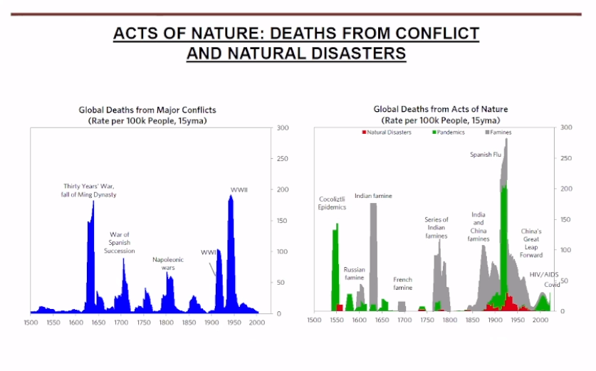 首先,自然之力。包括全球流行疾病,包括乾旱、洪澇災害,它們實際上是不頻繁的,但是一旦來襲影響非常大,它們造成非常多的死亡並且會顛覆很多的文明,比前三個因素還要更大,所以我們不能忽視自然之力。