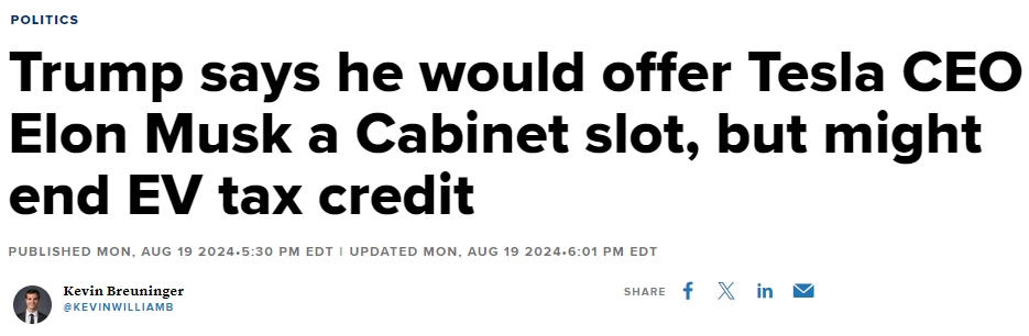 特朗普周一(8月19日)在接受路透社採訪時表示,如果馬斯克願意,他會任命他擔任這一職位(政府内閣)。但他指出,他将考慮取消某些新型電動汽車的7500美元稅收抵免,這可能會影響銷售電動汽車的特斯拉業務。