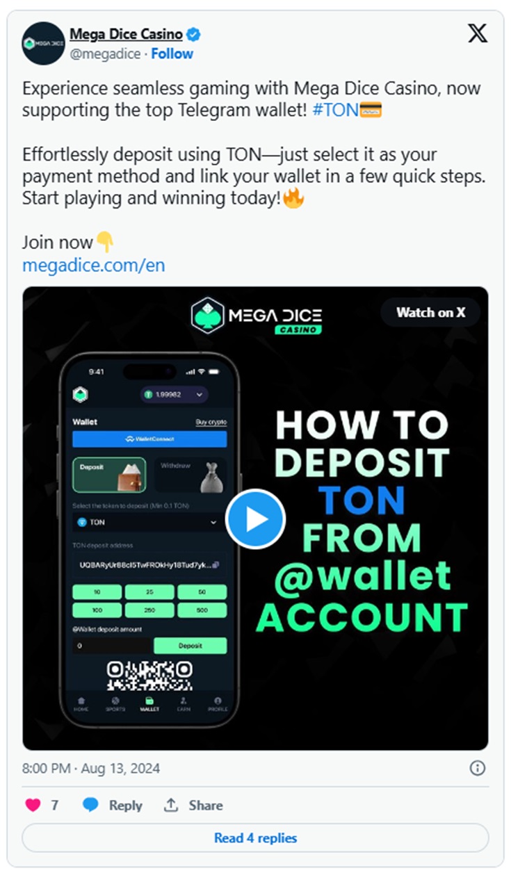 隨著最近集成了擁有超過1200萬活躍用戶的TON錢包,Mega Dice在進一步把握這一博彩行業增長機會方面具備了有利條件。