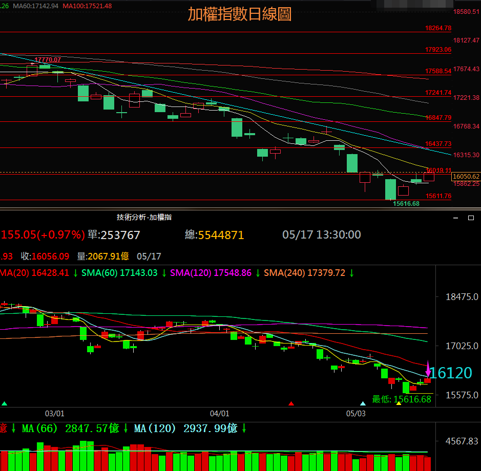 5月17日週二加權指數受亞股走揚幾美股期指翻紅的激勵開高走高,縮量收出一根光腳中實體紅K棒作用於區間【15610,16020】上限附近,後市需等待壓力區16020~16160附近的方向選擇。4月份月線收線收於月線級別多空分界位16300上方的16592.18點,5月9日加權指數下破16300,後市如果無法收復20月均線位16544.16將測試去年5月創造的低點15159.86,否則放量突破20月均線位將持續觸底後的看漲行情。日線形態上看加權指數突破之前形態的極限位置等待構建新的形態。週線上看,加權指數下破去年10月份16162.17點的低點,抵達100週均線位15766下方附近的15616.68點後上週收盤價收於該均線位之上的15832.54點,後市如果有效下破100週均線位將大概率向120週均線位14950附近運行;否則依託支撐區15470~15610和100週均線位企穩反彈,放量突破100週均線位上方的多空分界位16160時有望逐步反彈走出今年1月份以來持續5個月下跌走勢的底部。MACD指標綠色柱狀線創兩年以來的新低,相對強弱指標短期RSI下破50中軸線幾長期RSI持續震蕩下行同樣創兩年以來的新低,目前多數技術指標比較超賣,後市只要某個交易日放量上破16160,將確立週線級別的反彈走勢,結束今年的下跌走勢。目前上方壓力區為16020~16160,多空分界位為16160,下方支撐區為15470~15610,下方多空分界位為15470。