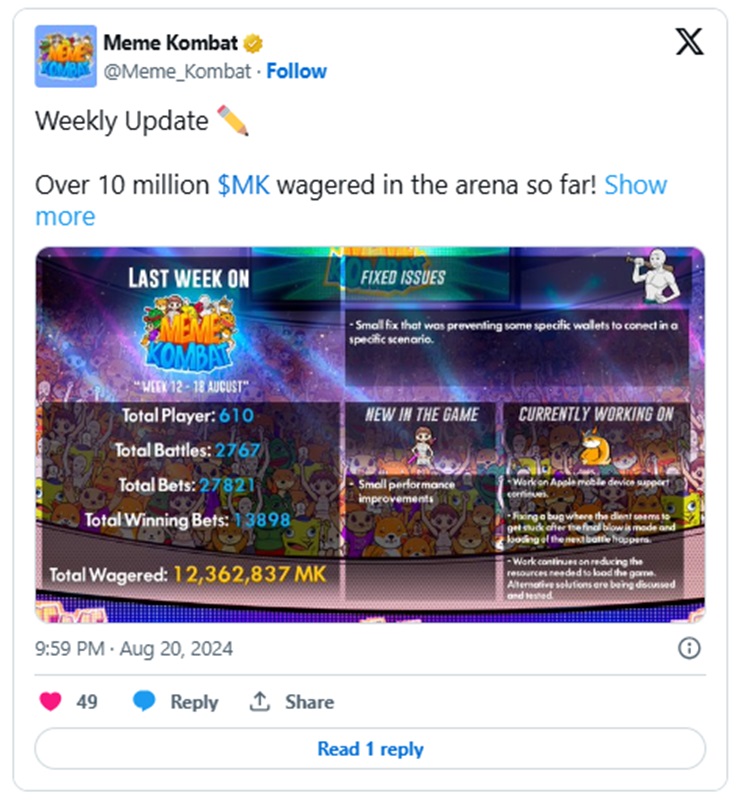 儘管在此過程中遇到了一些挑戰,Meme Kombat 團隊依然實現了其路線圖目標,並正向新的里程碑邁進。