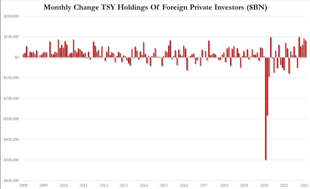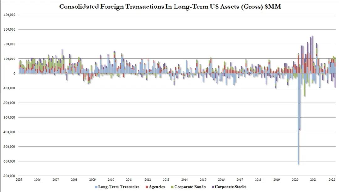 與此同時,俄烏衝突爆發導致全球地緣風險陡然上升且能源商品供應不足,市場對通膨前景的擔憂使得美國市場自3月以來頻繁遭遇股債雙殺。3月份海外投資者拋售的美股規模為943億美元,是有記錄以來的最大規模,幾乎是2月份254億美元的近4倍。