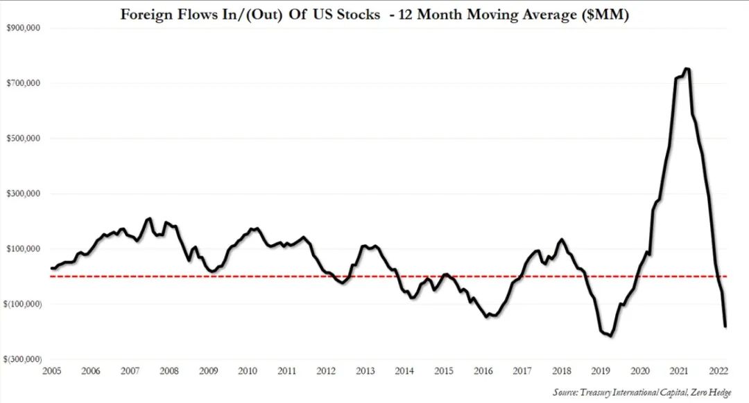 過去十二個月,海外投資者賣出了1800億美元的美國股票,略低於2018年末創下的紀錄,當時美聯儲被迫逆轉緊縮政策。