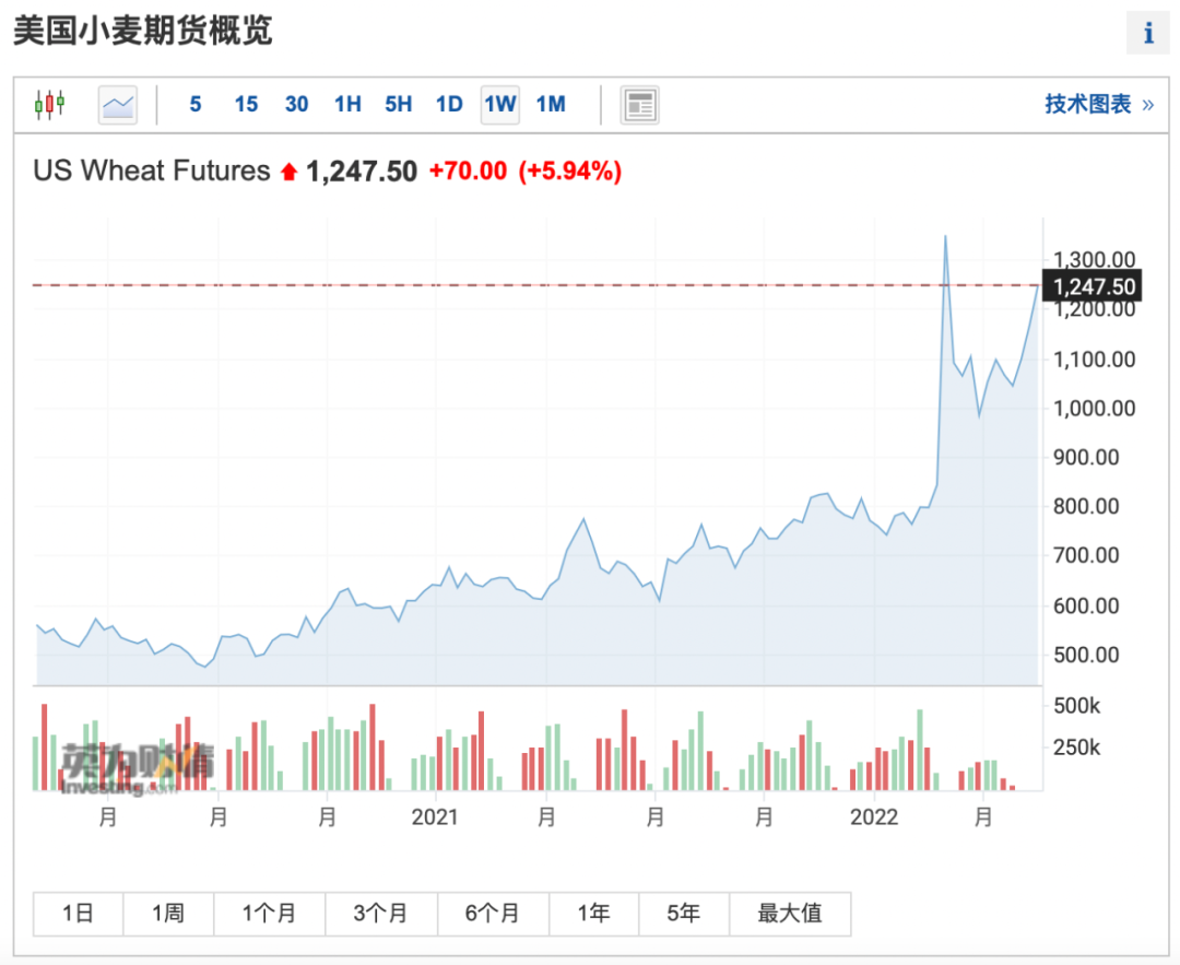 不僅是伊朗是這樣,現在全球各國的糧食幾乎都在瘋狂暴漲;週一美國的小麥期貨更是直接上漲了70美分!