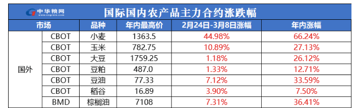 具體的上漲數字表現為,週一開盤後,美國芝加哥期貨交易所小麥、玉米、大豆期貨價格全線上漲。
