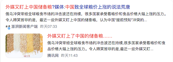 這些外國媒體到處都在煽動情緒,認為中國“預知”了俄烏衝突的發生,預知了全球會發生糧食危機,預知了糧食價格暴漲。