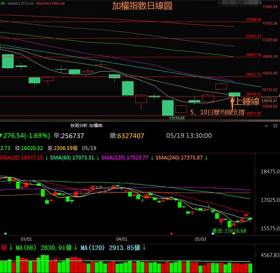 5月19日週四加權指數受隔夜美股大跌激勵跳空開低走低,縮量收出一根小實體長下影線強支撐形態的上錘陰線作用於日線級別多空分界位15880上方逐步震蕩企穩,後市需等待支撐區15880~16020幾壓力區16440~16575附近的方向選擇。4月份月線收線收於月線級別多空分界位16300上方的16592.18點,5月9日加權指數下破16300,後市如果無法收復20月均線位16544.16將測試去年5月創造的低點15159.86,否則放量突破20月均線位將持續觸底後的看漲行情。日線形態上看加權指數後市如果放量突破16575將構建頭肩底底部看漲形態。週線上看,加權指數本週上行上週高點附近測試5週均線位等待選擇後市運行方向;後市只要放量突破前期下降趨勢線幾壓力區16440~16575將打開新的上行空間走出今年1月份以來持續5個月下跌走勢的底部。MACD指標綠色柱狀線創兩年以來的新低後開始走平,相對強弱指標短期RSI下破50中軸線幾長期RSI持續震蕩下行創兩年以來的新低後於超賣區開始向上拐頭,目前多數技術指標超賣後開始修復,後市只要放量上破壓力區16440~16575將打開新的上行空間,確立週線級別的反彈走勢,結束今年的下跌走勢。目前上方壓力區為16440~16575,多空分界位為16575,下方支撐區為15880~16020,下方多空分界位為15880。