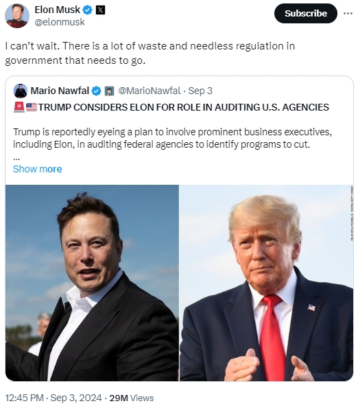 馬斯克周二(9月3日)寫道:「我等不及了,政府中存在許多浪費和不必要的監管,必須廢除。」