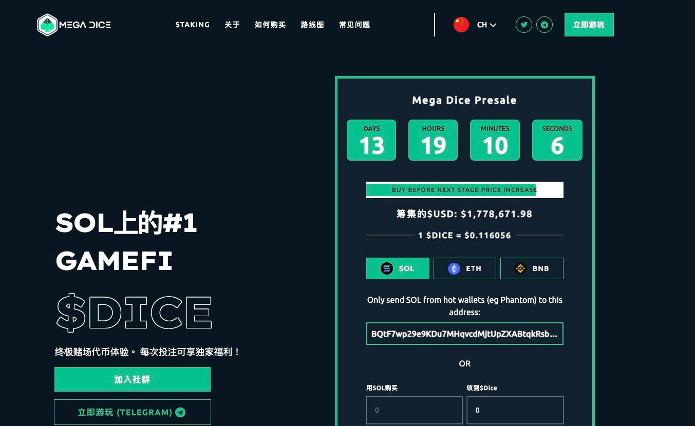 Mega Dice 平臺不僅在賭博行業取得了巨大成功,還即將推出其原生代幣 DICE。這是 Solana 區塊鏈上的首個 GambleFi 代幣,該消息迅速在投資界引發了熱議。DICE 的預售已經進入倒數第二階段,目前籌集的資金接近 200 萬美元,這表明投資者對該代幣充滿信心。
