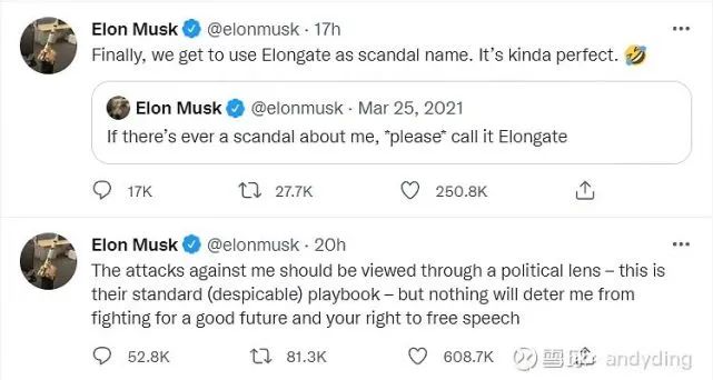 在Twitter上發起過回購特斯拉股票投票,一天發文六次拉漲狗狗幣價格,上演了一幕又幕公關戰的馬斯克,信心滿滿要將Twitter收入囊中。