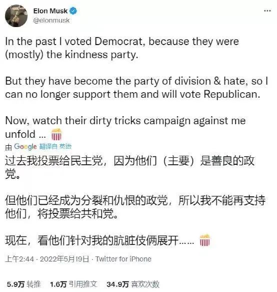 在這場收購行動中,馬斯克展示給外界的形象宛如一位“白衣騎士”。他稱Twitter“既不會蓬勃發展,也不能為言論自由服務”,而投資正是因為“它有可能成為全球的一個言論自由平台,言論自由是民主制度正常運作所必要的社會條件。”