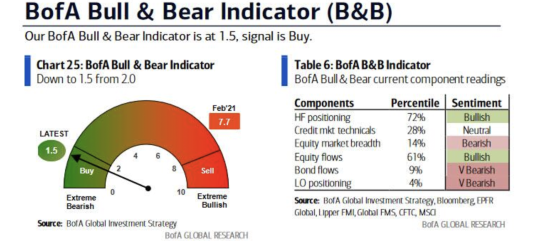流入資金不斷減少的情況下,美銀牛熊市指標目前為1.5,遠低於今年2月份的3.8,顯示出市場情緒“極度悲觀”。
