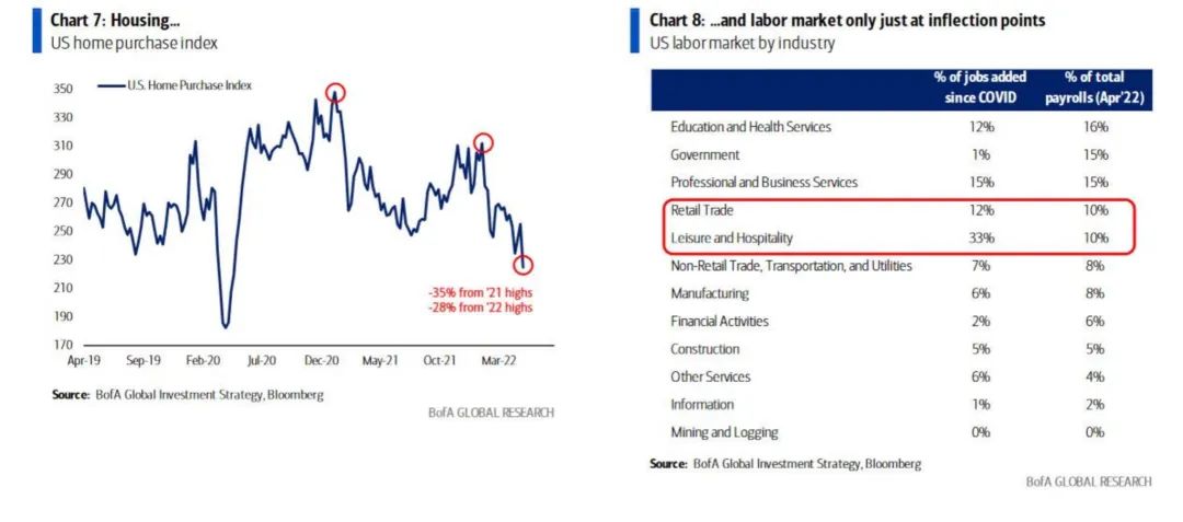 Hartnett還討論了近期出現最多的“衰退”,他指出,住房和勞動力市場僅處於拐點,美國貸款申請量較今年年初下降了28%,零售和休閒行業新增就業人數下滑。