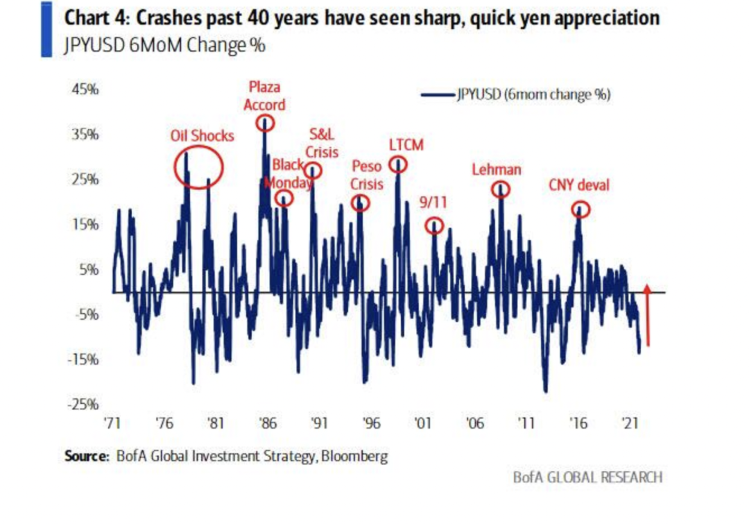 關於如何對沖熊市?根據美銀的說法,日元和瑞士法郎士良好的對沖工具,過去40年幾乎每次華爾街崩盤都會看到日元迅速大幅升值。