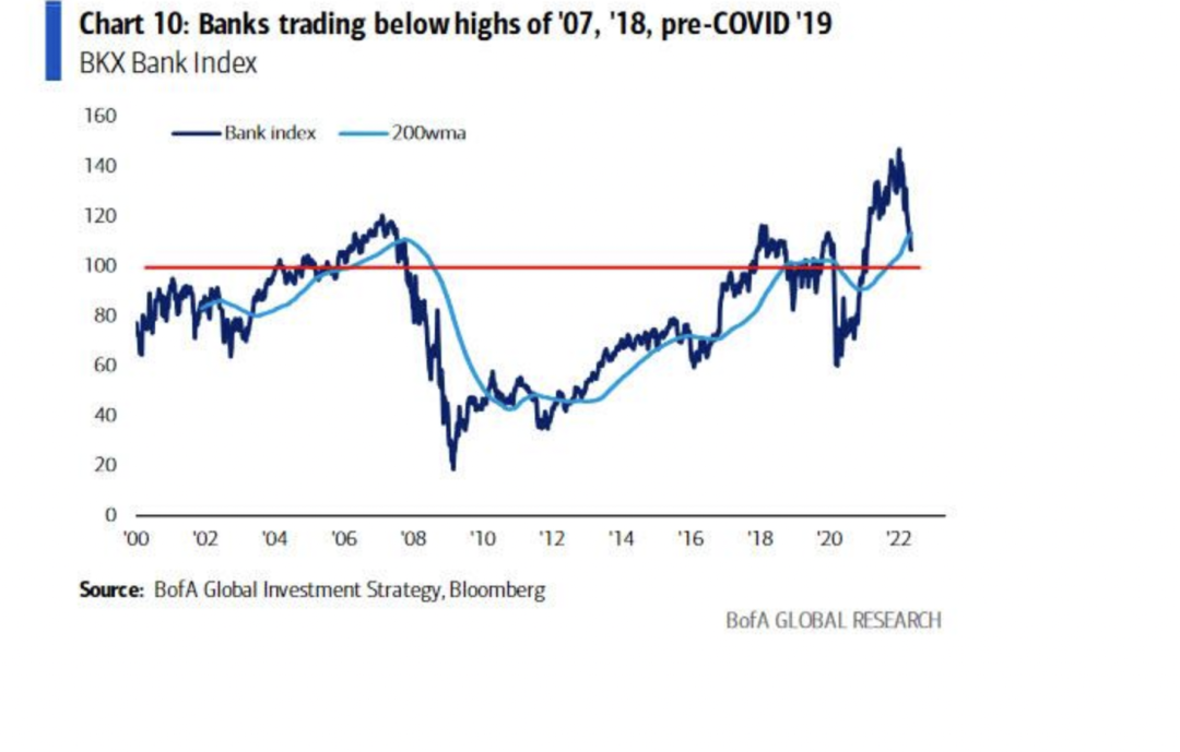 最後,Hartnett指出銀行可以說是金融體系中最安全的組成部分,但KBW銀行指數(BKX)低於2007年、2018年以及2019年疫情爆發前的高點。Hartnett表示: