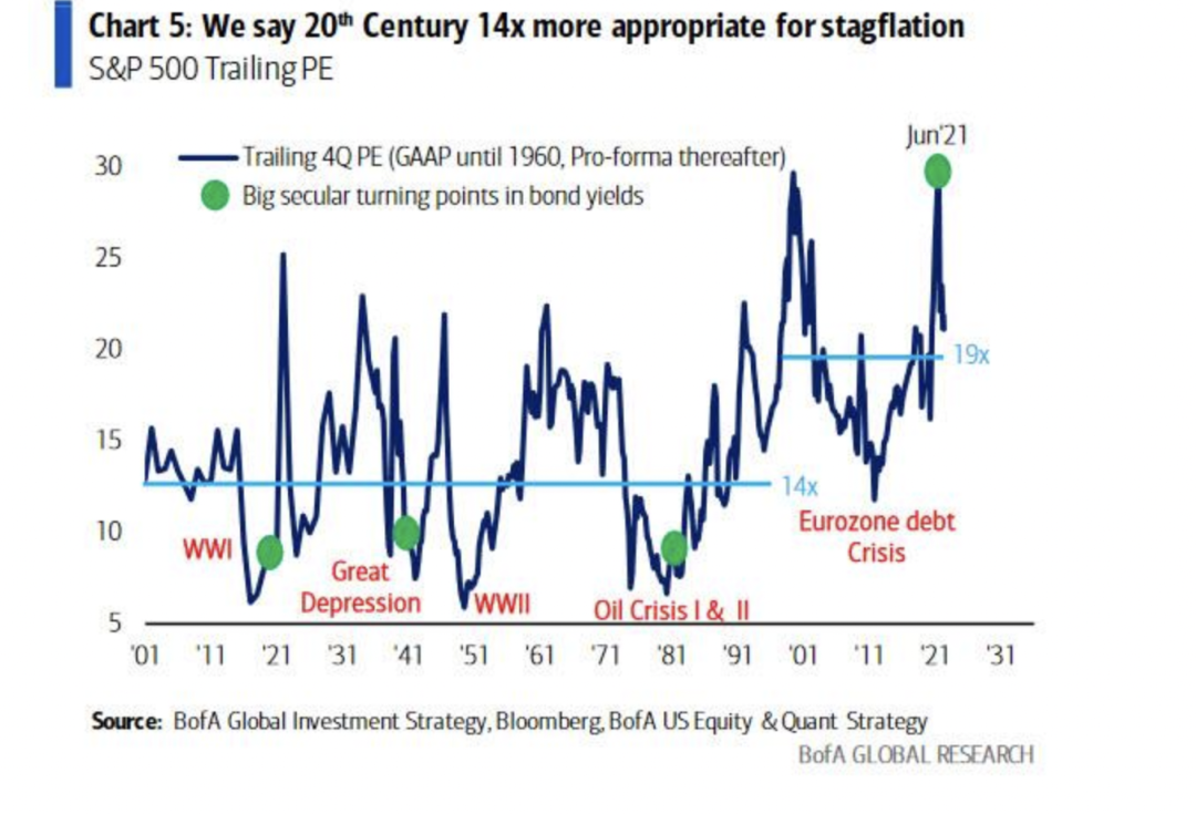 雖然有人說21世紀的19倍最為合適,但我認為20世紀的14倍更適合滯脹。