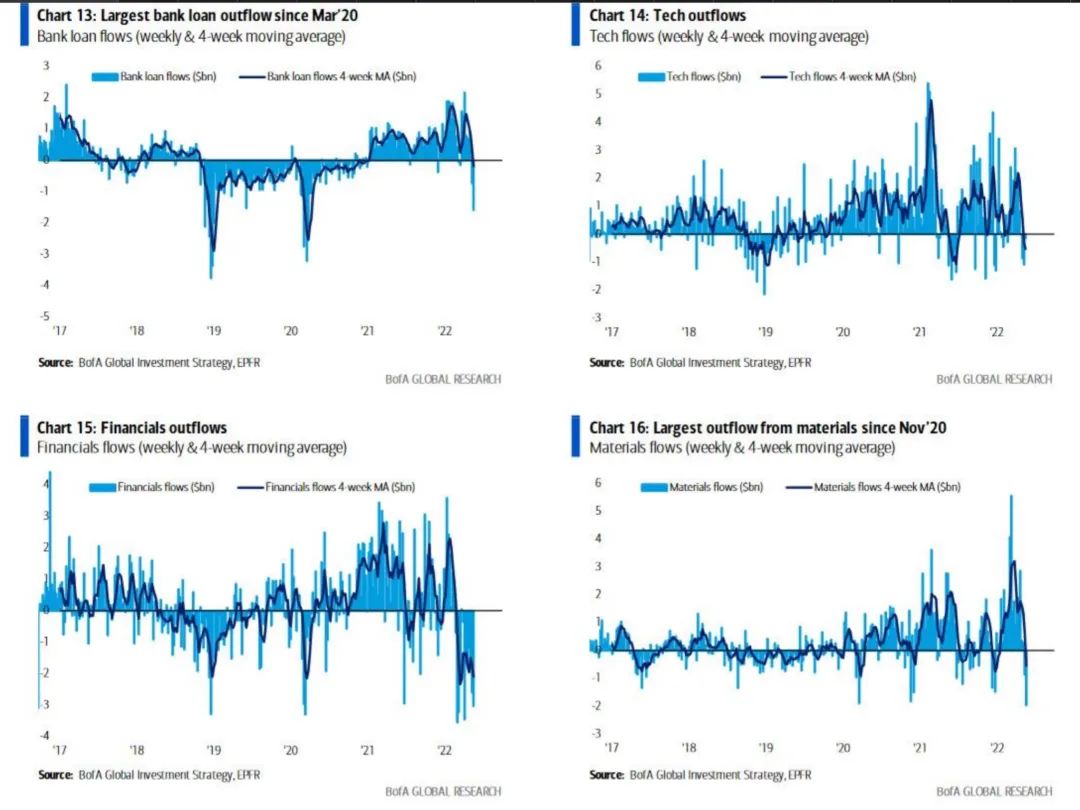 在這一背景下,上週資產拋售加劇,新興市場債務贖回量達到3月20日以來的最大值(61億美元)、銀行貸款減少量為3月20日以來的最大值(16億美元)、科技和金融類股票資金流出量2016年9月以來的最多(17億美元),材料類股創2014年10月以來的最大流出(20億美元)。