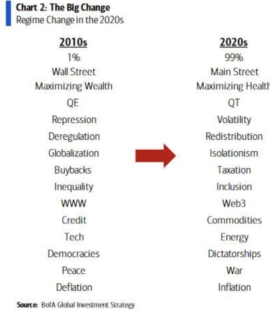 21世紀20年代的主線是製度變革——由社會不平等性、民粹主義/進步主義、地緣政治衝突、淨零碳排放、去全球化經濟、人口下降、通貨膨脹驅動的高通脹、高利率、高波動性& 低估值,市場更偏向“現金、商品、實物資產、波動性、小盤股”等,所有這些將損害債券、信用債、私募股權和科技股。