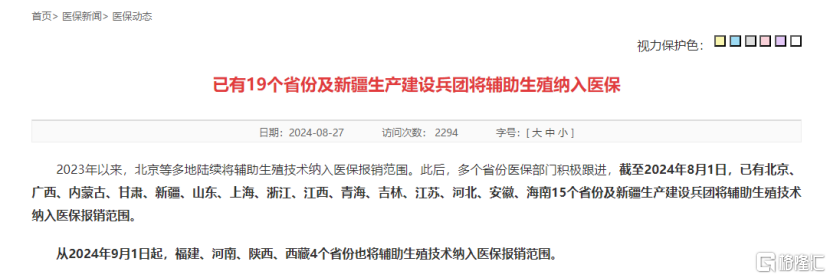 Moreover, the policy has greatly stimulated the number of assisted reproductive visits based on the regions that have already been included in healthcare insurance. Previously, a person in charge of the medical security bureau of Guangxi Zhuang autonomous region responded to an interview with China Youth Daily and mentioned that from the implementation of the policy in November 2023, the outpatient volume of assisted reproductive institutions in the entire autonomous region reached 607700 times, a year-on-year increase of 35.6%.
