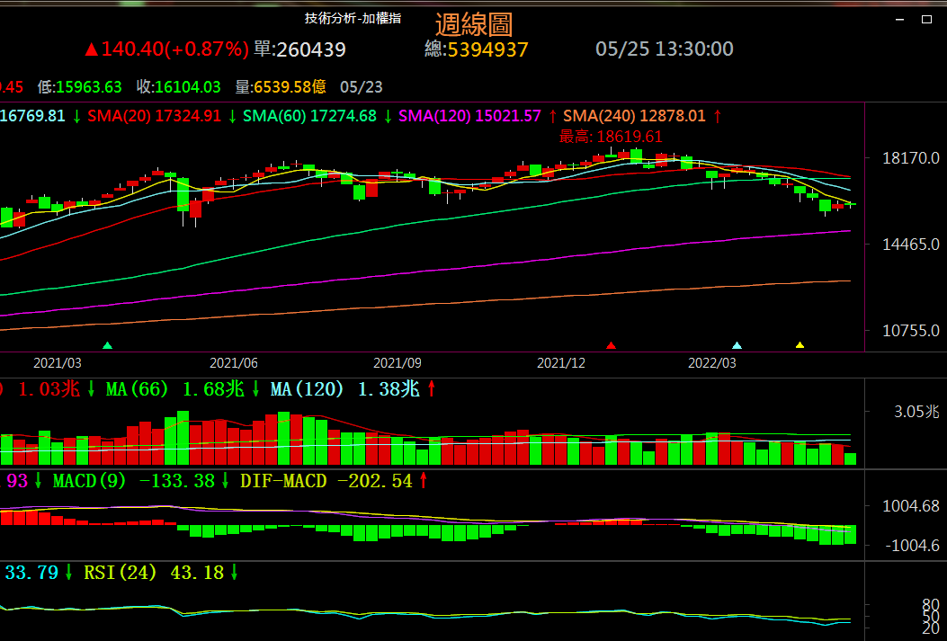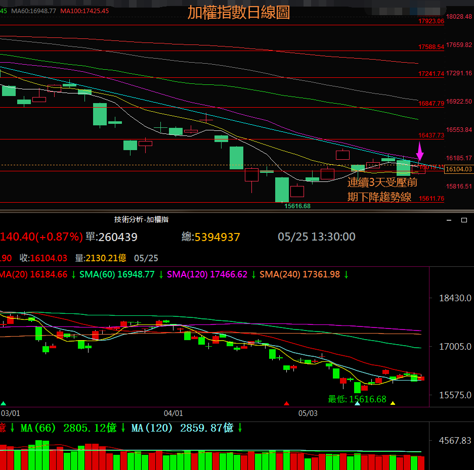 5月25日週三加權指數依託多空分界位15880上方附近支撐作用開高走高,微放量收出一根上影線較長中實體的紅K棒,連續3天作用於前期下降趨勢線幾20天均線位受壓回撤,盤中最高抵達16169.18點。後市如果放量突破前期下降趨勢線幾20天均線有望重拾反彈,然後需等待上方壓力區16440~16575附近的方向選擇;否則如果有效下破15880將會再次向下方支撐位15610附近運行。4月份月線收線收於月線級別多空分界位16300上方的16592.18點,5月9日加權指數下破16300,後市如果無法收復20月均線位16544.16將測試去年5月創造的低點15159.86,否則放量突破20月均線位將持續觸底後的看漲行情。日線形態上看加權指數後市如果放量突破16575將構建頭肩底底部看漲形態。週線上看,加權指數上週上行測試5週均線位縮量收出偏整理形態的小實體陽線,本週持續作用於5週均線位;後市只要放量突破前期下降趨勢線幾壓力區16440~16575將打開新的上行空間走出今年1月份以來持續5個月下跌走勢的底部。MACD指標綠色柱狀線創兩年以來的新低後開始縮小,相對強弱指標短期RSI下破50中軸線幾長期RSI持續震蕩下行創兩年以來的新低後於超賣區上拐走平,目前多數技術指標超賣後開始修復,後市只要放量上破壓力區16440~16575將打開新的上行空間,確立週線級別的反彈走勢,結束今年的下跌走勢。目前上方壓力區為16440~16575,多空分界位為16575,下方支撐區為15880~16020,下方多空分界位為15880。